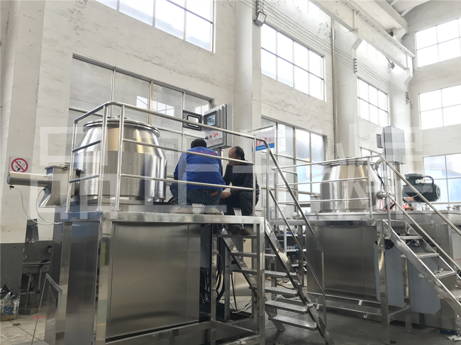 經(jīng)真空抽吸(或人工上料)進(jìn)入容器中的物料通過混合加入粘合劑后在改型的攪拌器的作用下呈環(huán)向、徑向、軸向運(yùn)動(dòng),充分混合,再經(jīng)制粒切刀切割成質(zhì)地均勻、致密的球形顆粒。