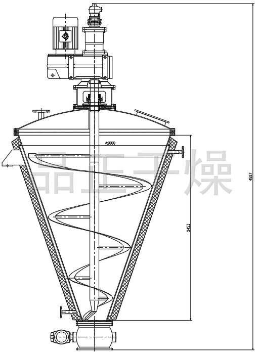 加熱錐體設有加熱夾套,熱源為熱水、導熱油或低壓蒸汽,從而能使錐體內壁保持一定的加熱溫度。工作時,在真空泵的作用下,機內保持一定的真空條件。傳動系統帶動螺旋帶狀攪拌裝置旋轉(同時可以設置加熱),物料在攪拌的作用下在設備內部不斷地翻動,并與錐體內壁充分接觸,實現熱量傳遞,從而使物料內部水分不斷蒸發(fā),水蒸汽由真空泵引出,經冷凝器收集。干燥完成后,打開下部的出料閥出料。