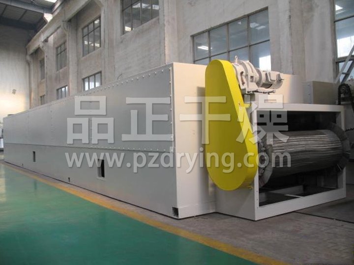 整個生產線為全封閉型(對物料而言),由擺動布料段、干燥段、出料段三部分組成。擺動布料段作用使海藻均勻分散在網(wǎng)板上,并且勻速輸送到干燥段,海藻經(jīng)過80℃熱風干燥段,90℃熱風干燥段和120℃熱風干燥段后,再經(jīng)過出料段排料。循環(huán)風向及各單元內風的循環(huán)為向下式,即加熱后的空氣由引風機吸入,在風機出風口首先預分布再經(jīng)過孔板均風后,熱風從物料的下面向上(或從物料的上面向下)穿透物料層。